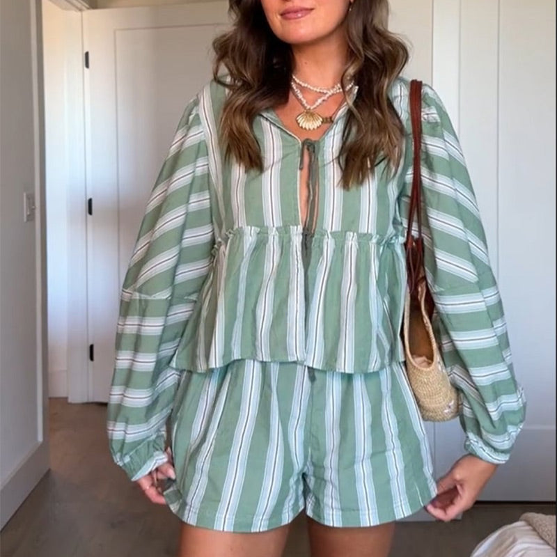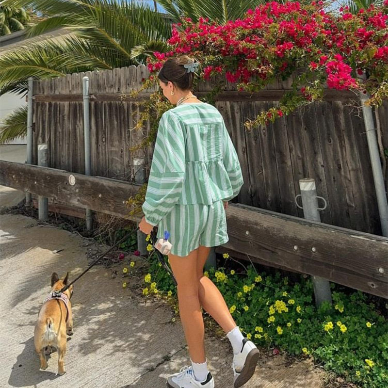 The coordinating striped shorts seamlessly complement the top, creating a harmonious, unified outfit.