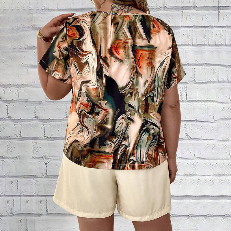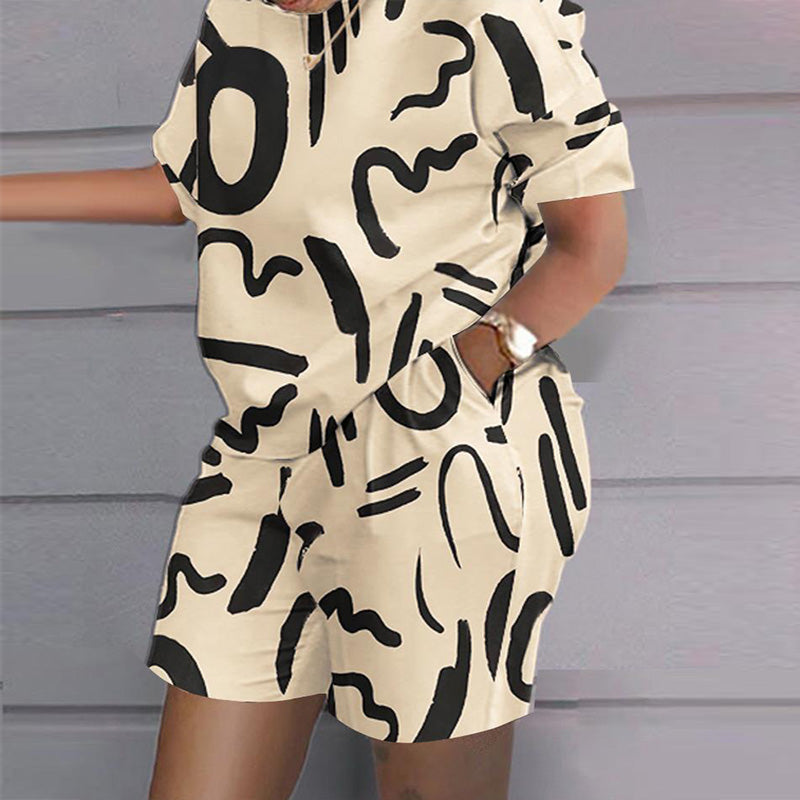 This stylish two-piece set features a print short sleeve tee and matching shorts, perfect for comfortable and fashionable summer style.
