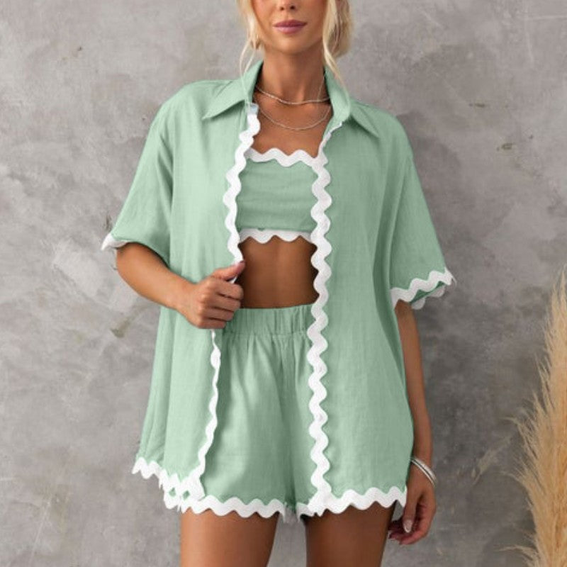 TRENDY DESIGN - A fashionable 2-piece set featuring a shirt top and high-waisted shorts for a stylish summer look.